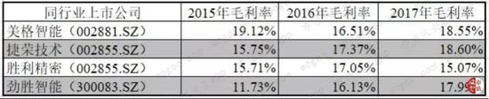 从表中明显看出,同行业毛利率几乎都在15%~19%间徘徊,仅为龙昕科技结构件毛利率的57.64%、综合毛利率的68.44%。