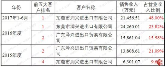 自2015年起,润兴和泽兴在龙昕科技营收占比中由30.72%上升至48%,且润兴在前五大客户中的排位和营收占比中逐年上升,并在2017年1-6月跃升为龙昕科技的第一大客户,几乎占据龙昕科技营业收入的50%,可谓独领风骚。
