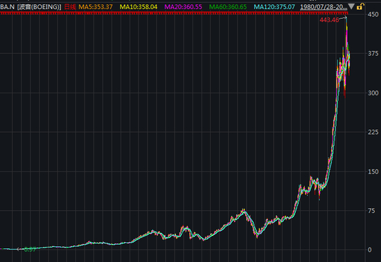今年1月,随着波音的老对手空中客车公司在其雄心勃勃的空客A380计划上失败后,波音股价在随后两个月上升了36%,跑赢所有道指成分股,后者的反弹幅度仅为约11.6%。今年3月1日,波音股价盘中曾创出443.46美元的历史高点。