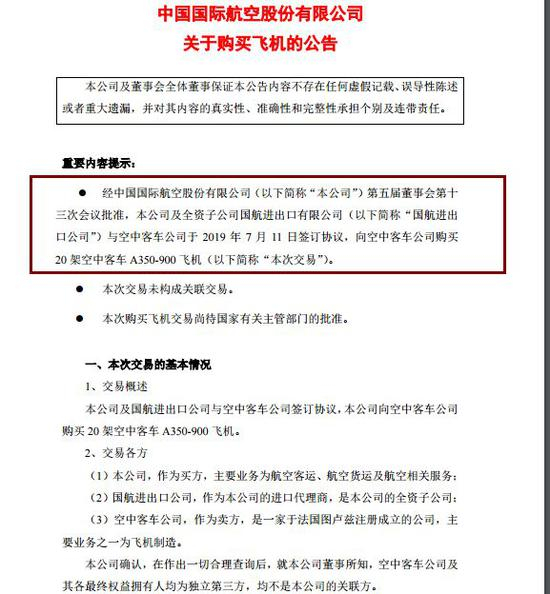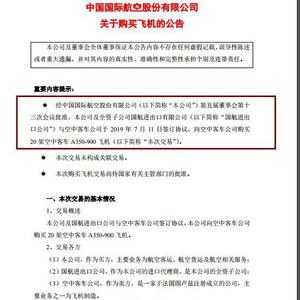 今日晚间,中国国航发布《关于购买飞机的公告》称,公司及国航进出口公司与空中客车公司签订协议,本公司向空中客车公司购买20架空中客车A350-900飞机。