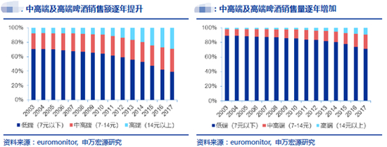 事实上,近年来国内啤酒市场消费结构已经发生了一系列转变。低端淡啤的市场份额在逐年下降,而中高端啤酒的市场份额则在加速增长。从申万宏源研报行业数据发现,我国啤酒不再依赖销量增长,而是在消费升级下带动的啤酒高端化趋势明显。根据euromonitor终端数据看,低端啤酒的销售额占比从2003年的70%下降至2017年不到40%;而高端酒从2003年不到8%上升到2017年的近30%。中高端销量数据也从2003年的10.8%上涨到2017年的28.8%。