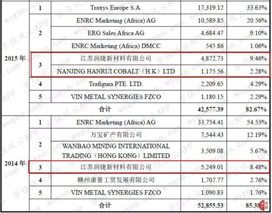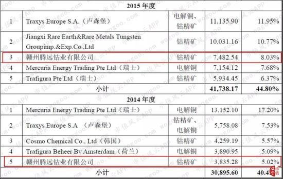 NANJING HANRUI COBALT(H.K)LTD(香港寒锐)与江苏润捷新材料有限公司同为寒锐钴业子公司。在寒锐钴业招股说明书披露的前5客户中,其2014年及2015年对赣州腾远钴业有限公司的销售额分别为3,835.28万元及7,482.54万元。