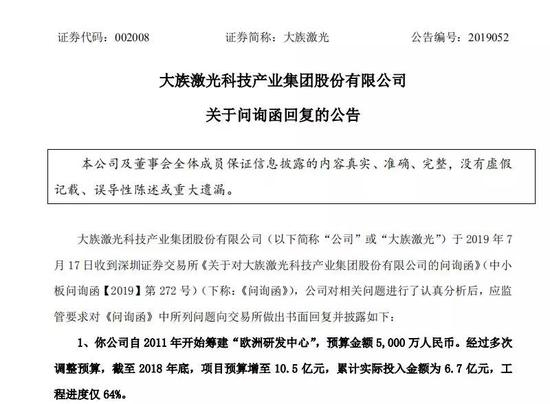 7月21日,大族激光回应了深交所于7月17日发送的问询函,回应了外界对其建设多年尚未完工、并多次增加投资预算的欧洲研发中心项目带来的系列质疑,并解答了欧洲研发中心与大股东大族控股之间是否存在资金占用,以及应付职工薪酬余额较高问题。
