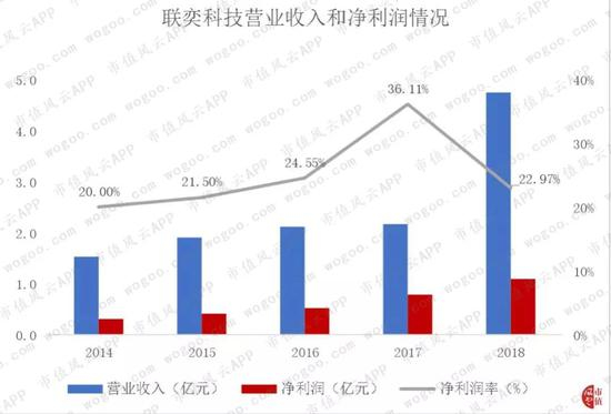 2014-2018年,联奕科技的营收和净利润稳步增长,净利润率保持在20%以上。