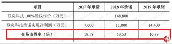 要是用交易对价和承诺业绩的比值,作为市盈率的话,则2017年,联奕科技的交易市盈率为19.58倍。