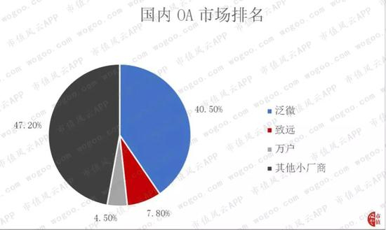 在国内OA市场内,泛微一家就占据了市场的40.5%,龙头地位明显。而万户网络排名第三,仅占4.5%。