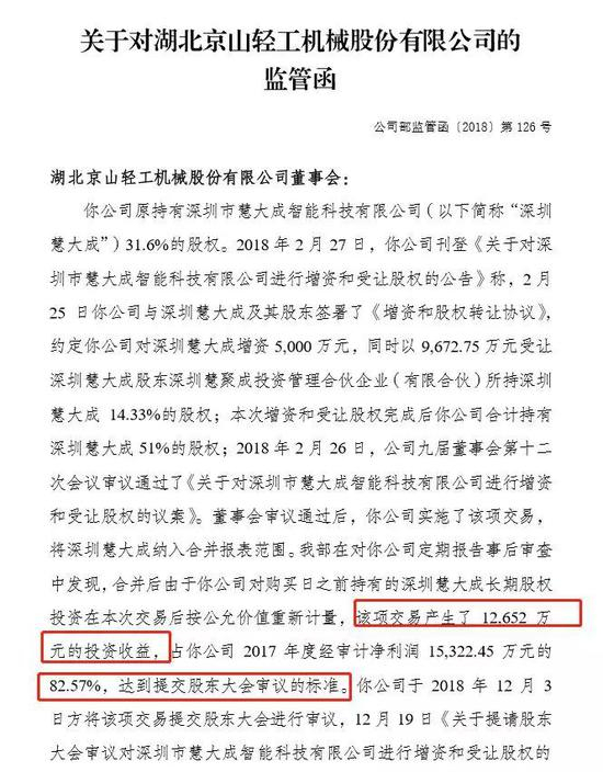 这次是谢杏平在公司董秘任上,京山轻机领到的第四张监管函。最近一次是2018年12月,公司在2018年2月时,通过增资和受让股权形式完成了对深圳慧大成51%的控股权。合并后由于京山轻机对购买日之前已经持有的深圳慧大成长期股权投资在合并报表后按公允价值重新计量,该项交易产生了1.27亿元的投资收益,占公司2017年度经审计净利润的82.57%,达到提交股东大会审议的标准,公司没有及时提交股东大会审议就完成了并表。