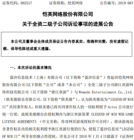 这一事件要追溯到2016年10月25日,恺英网络的控股子公司浙江欢游与韩国娱美德娱乐签署协议,双方约定娱美德娱乐将传奇IP的手游和页游的改编权授予浙江欢游,为此浙江因支付500 亿韩元(折合人民币约 2.98 亿元)的定金。