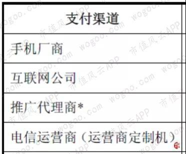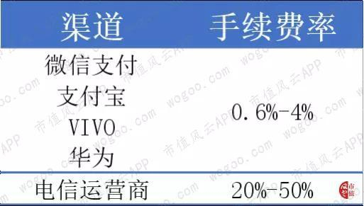 第三方渠道包括微信支付、支付宝、VIVO、华为以及电信运营商,手续费率如下图所示。