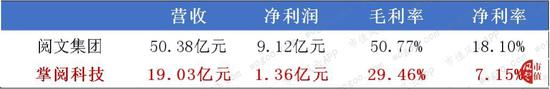 2018年,阅文集团营收50.38亿元,为掌阅科技的2.65倍,净利润为9.12亿,为掌阅科技的6.71倍。