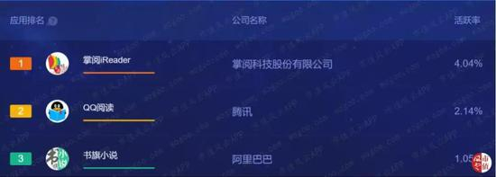 根据TalkingData的数字阅读平台排名,掌阅iReader高居榜首,活跃率为4.04%。第2、3名分别为,腾讯旗下的QQ阅读和阿里巴巴旗下的书旗小说。