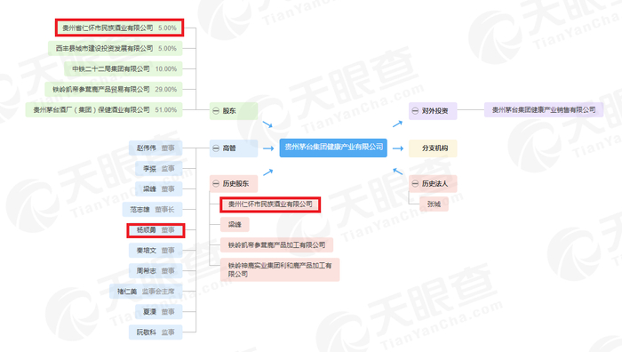 事实上,民族酒业与中国贵州茅台酒厂(集团)有限责任公司(简称“茅台集团”)并非毫无关系。据民族酒业方面证实,其官网所称代工13年的某大型国有酒企正是茅台集团。而且,民族酒业还与茅台集团存在一定的关联关系。天眼查显示,民族酒业持有贵州茅台集团健康产业有限公司5%的股份,民族酒业的法定代表人、执行董事兼总经理杨顺勇也在其中担任董事;而贵州茅台集团健康产业有限公司由茅台集团全资子公司贵州茅台酒厂(集团)保健酒业有限公司持有51%股权。