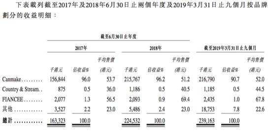 根据招股书资料显示 ,2017财年、2018财年和2019年财年的前9个月,Canmake实现收入分别为1.57亿港元、2.16亿港元和2.17亿港元,分别占当期营业收入的比例为96%、96.2%和90.7%,成为公司业务收入的第一大品牌。