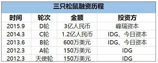 在成立后的第二个月,三只松鼠就获得了“国潮品牌” 执牛耳者IDG资本150万美元的天使投资,拿到第一笔创业资金;次年又获“投资女王”徐新的今日资本投资。此后IDG不断增加投资,2015年获得的峰瑞资本的3亿人民币的投资,而峰瑞资本正是IDG前合伙人李丰创立的。