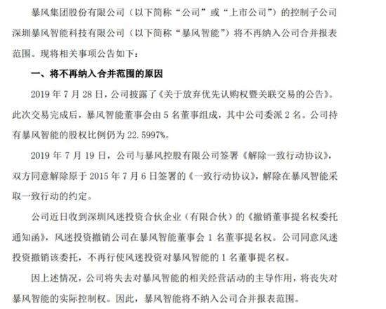 暴风集团表示,因上述情况,公司将失去对暴风智能的相关经营活动的主导作用,将丧失对暴风智能的实际控制权。因此,暴风智能将不纳入公司合并报表范围。