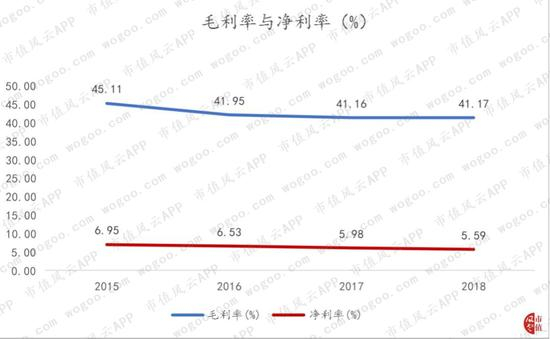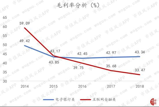 拆分来看,互联网金融类产品的毛利率下降幅度较大,从2014年的59.09%下降到2018年的33.47%。