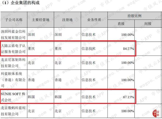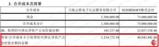 科蓝软件分别花了2550万元和7300万元,取得大陆云盾84.27%的股份和SUNJE SOFT 67.15%的股份,从而分别形成0.11亿和0.41亿的商誉。