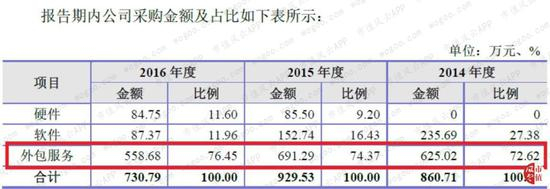 2016年,公司的大部分的采购是外包服务,占总采购金额的70%以上。