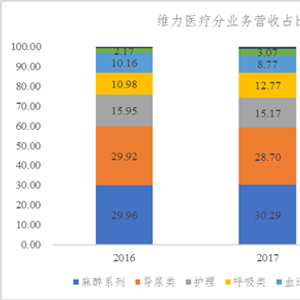 剥离血液透析中心业务后,公司业务范围将主要覆盖麻醉、泌尿、护理、呼吸、泌尿外科五大业务领域,截至2018年底,五大业务营收占比分别为30.05%、28.37%、14.16%、9.84%、7.15%。