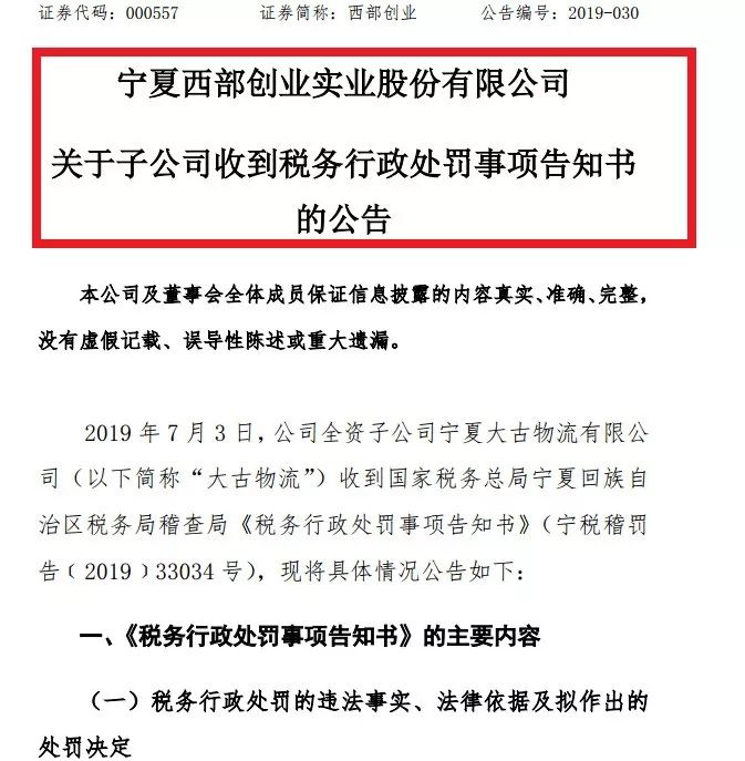 7月4日晚,西部创业发布公告称,旗下大古物流收到宁夏税务稽查局《税务行政处罚事项告知书》。