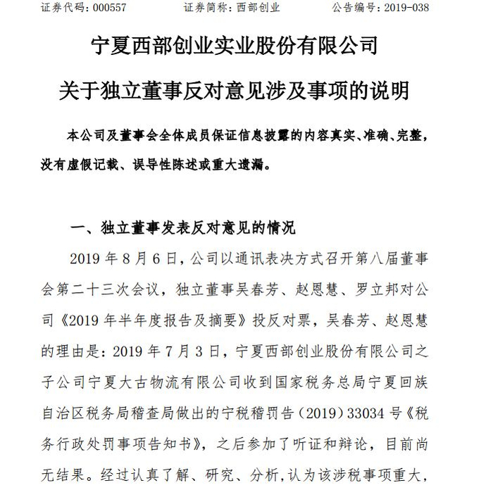 这三名独立董事认为,2019年7月3日,宁夏西部创业股份有限公司之子公司宁夏大古物流有限公司收到国家税务总局宁夏回族自治区税务局稽查局做出的宁税稽罚告(2019)33034号《税务行政处罚事项告知书》,之后参加了听证和辩论,目前尚无结果。