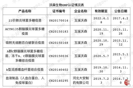 既然是搞疫苗的,就不得不说GMP认证。GMP认证是疫苗投产的先行条件,截至2018年底,沃森生物疫苗产品通过GMP认证的有6种,具体情况如下所示: