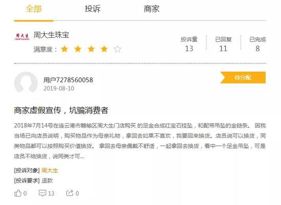 据7月31日消费者发起的投诉显示,“购买当天说拿回去我妈不喜欢可以换,链子,吊坠都能换,店面里的只要喜欢的都可以按照原价折算成金额进行换货,第二天去换货,店员表示,换是可以换,但是只能同类进行换货。问了她,什么样算同类的,她才解释。就是购买第一天,店员故意隐瞒欺骗消费者。”