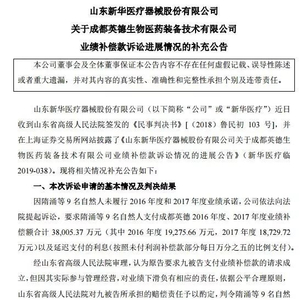 新华医疗8月15日公告称,近日收到山东省高级人民法院签发的《民事判决书》。根据该判决,公司并购标的成都英德生物医药装备技术有限公司(以下简称英德公司)的9名原股东的业绩承诺将从此前的3.8亿元打折,按照1.33亿元履行业绩承诺义务。其理由是上市公司派人参与了经营管理。