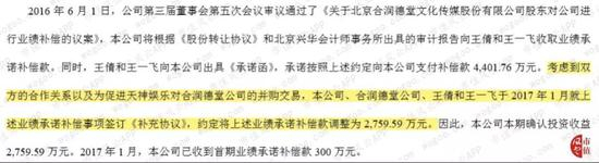由于合润德堂公司未能完成业绩承诺,按约定,原股东王倩和王一飞应赔偿华策影视4,401.76万元,但华策影视考虑到合作关系及为促成天神娱乐对合润德堂的收购,最终确定补偿金额为2,759.59万元。