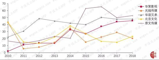 华策影视的营业收入由2010年的2.82亿元增长至2018年的57.97亿元,8年增长约20倍,年均复合增长率为45.9%,从营收增速来看,其成长性并不算慢。