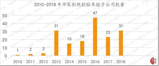 华策影视自2013年以来,接连投资了不少公司。从参控股子公司数量看,2010年仅有1家,到2018年已增长至31家。