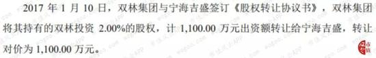 在此之前的2017年1月,双林集团以1元/股的价格,将双林投资2%的股权转让给宁海吉盛传动技术有限公司(以下简称“宁海吉盛”)。