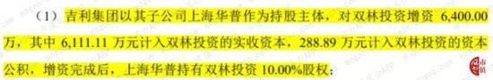 2017年7月,双林集团同意浙江吉利控股集团有限公司(以下简称“吉利集团”)的子公司上海华普汽车有限公司(以下简称“上海华普”)以1.047元/股的价格对双林集团进行增资,6,400万元占比10%,这时双林投资的价值为6.4亿元。