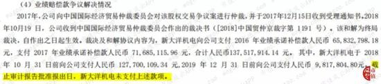 德洋电子业绩承诺不达预期,公司就德洋电子原控股股东及鲍老板承诺的业绩补偿款申请仲裁。经裁定后,新大洋机电及鲍老板共需向公司支付1.38亿元的业绩补偿款。