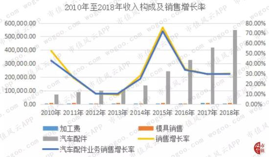 公司自2010年上市以来,收入包括三类:汽车零配件销售、模具销售及加工业务。其中汽车零配件业务收入每年占比均在90%以上,占比较高且较为稳定,模具销售和加工业务收入占比较小。