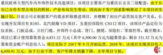 重庆旺林大型汽车内外饰件技术改造项目更是离奇延期5年多,截至2018年末尚未达产!延期原因是客户产业布局变动影响。该项目2018年由于行业下滑、客户年降及销量下降,项目处于亏损状态。