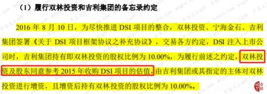 这个定价公司也有解释,2016年8月,双林投资于吉利集团签订了协议,待DSI公司注入上市公司时,吉利集团要持有双林投资10%的股权。