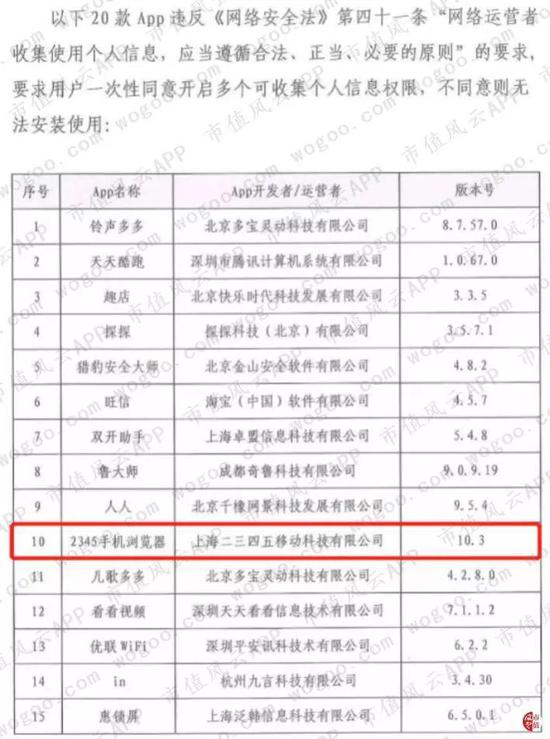2019年7月11日,由中消协等成立的APP专项治理工作组发布通报,2345手机浏览器app由于收集客户个人信息违反网络安全法,要求30日内整改完毕。