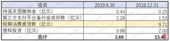 其中,截至2019年6月30日,应收账款中期初4.29亿的应收融资租赁及保理款消失了,其他流动资产明细中的短期消费类贷款9.71亿余额为0,2018年末累计已计提的短期消费贷款坏账准备6.11亿也已转回,不计提了。