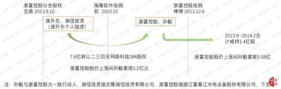 庞升东通过卖出二三四五网络科技股权获得7.6亿现金转让款,孙毅则借由浙富控股(002266.SZ)股票受利好消息股价上涨,在不到半年的时间里合计套现10.78亿。