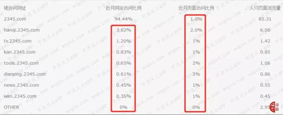 其兄弟站点2345天气、2345影视大全等的月页面访问比例均在2 %或以下。