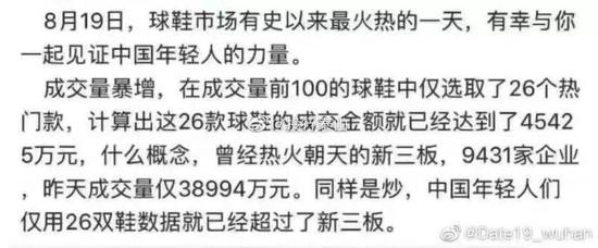 8月19日,在成交量前100的球鞋中,26个热门款的成交金额已达到4.5亿元,超过同日新三板9431家公司的成交量。