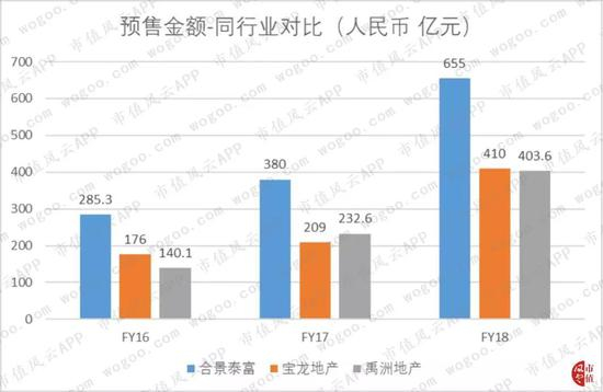 合景泰富的预售金额一直最高,2018年为655亿元,同期宝龙地产和禹洲地产分别为410亿元和404亿元。