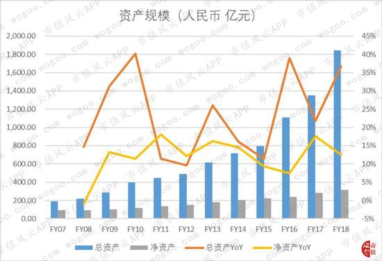 2018年,公司的总资产规模达到1845亿元,同比增长36.7%,以2007年为基准,CAGR为23%。同年,净资产规模达到317.7亿元,同比增长12.5%,以2007年为基准,CAGR为11.8%。