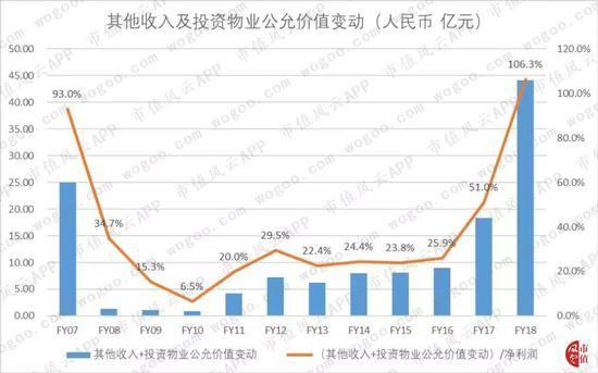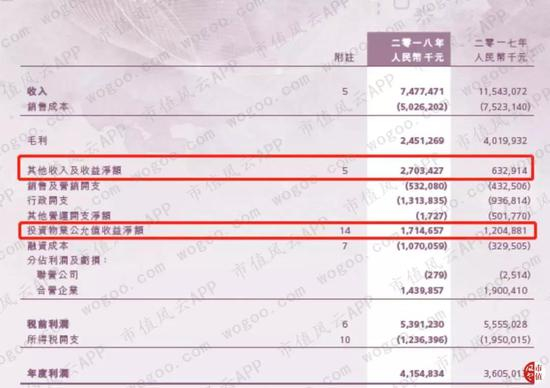 除了上述提到的附属公司的出售之外,我们发现2018公司账上的“其他收入及收益净额”和“投资物业公允值收益净额”数额很大。2018年,其他收入27亿元,投资物业公允价值收益为17.1亿元,合计44.1亿元,占当期税前利润82%。
