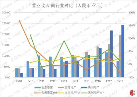 看完资产规模,我们再来看下营业收入状况如何。虽然合景泰富的总资产规模在三家公司中排名第一,但是营业收入自2015年开始就一直垫底。