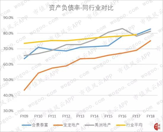 地产公司一直以高杠杆著称,这三家公司的资产负债率也不例外。2018年,合景泰富、宝龙地产和禹洲地产的资产负债率分别为82.8%、75.2%和81.4%。
