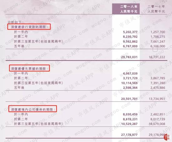 公司的银行及其他贷款、优先票据、境内公司债券及应付融资租赁分别为297.8亿元、205亿元、271.8亿元和3.2亿元。看一下账龄分布,各项借款的账龄分布较为均衡。