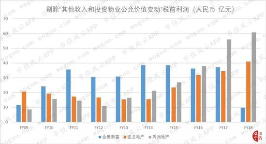 如果将三家公司的“其他收入及收益净额”和“投资物业公允值收益净额”从税前利润中剔除的话,可以看到合景泰富的经调整后税前利润在2018年出现大幅下滑,仅为9.7亿元,并且远低于宝龙地产40.9亿元,和禹洲地产60.7亿元。