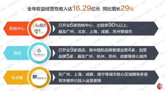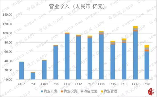 公司将旗下业务分为四个板块,在2018年这四个板块的营业收入占比分别为:物业开发占比81.1%,物业投资占比5.1%,酒店运营占比6.3%,物业管理占比7.6%。